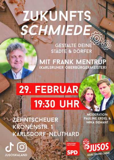 Die Jusos Karlsruhe-Land, die Jugendorganisation der SPD im Landkreis veranstaltet am 29.02.2024 um 19:30 Uhr ihre Auftaktveranstaltung „Zukunftsschmiede“ zum Kommunalwahlkampf in der Eventlocation Zehntscheuer in Karlsdorf-Neuthard (Kronenstraße 1). Hier treffen sich motivierte Jugendliche mit Oberbürgermeister Frank Mentrup aus Karlsruhe, um über die Zukunftsthemen der Städte und Dörfer zu sprechen. Über 40 engagierte Juso-Kandidierende treten auf den SPD-Listen im Landkreis Karlsruhe bei den Kommunalwahlen an.